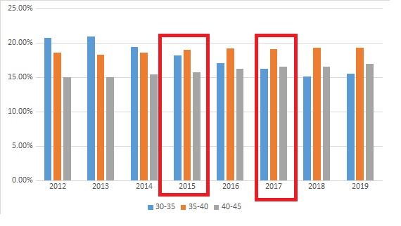 在認真調查了一番後,發現現在台灣的首購族年紀愈來愈大,根據財團法人金融聯合徵信中心的資料顯示,2008年至2014年,新增房貸族皆以30歲至35歲的族群最多,其次為35歲至40歲居多。但是到了2015年之後,則以35歲至40歲居多、30歲至35歲次之;然而,更可怕的是,到了2017年,新增房貸族雖仍以35歲至40歲居多,但第二多者為40歲至45歲(詳見圖1)!