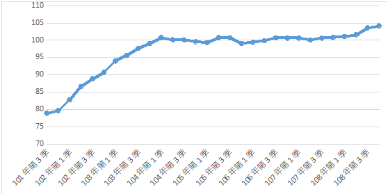 搭配台灣房價來看,根據內政部不動產資訊平台的全國房價指數,其實可以觀察到,全國房價自金融海嘯後開始起漲,到了2015年第1季迎來第一波高點,指數為100.77,隨後房價反轉修正,許多購屋族預期房價能修正個2、3成,殊不知,房價只修正、盤整了3年多,最新2019年第4季的房價指數又創新高,來到104.14(詳見圖2),難怪人家都說低點總在回頭後。