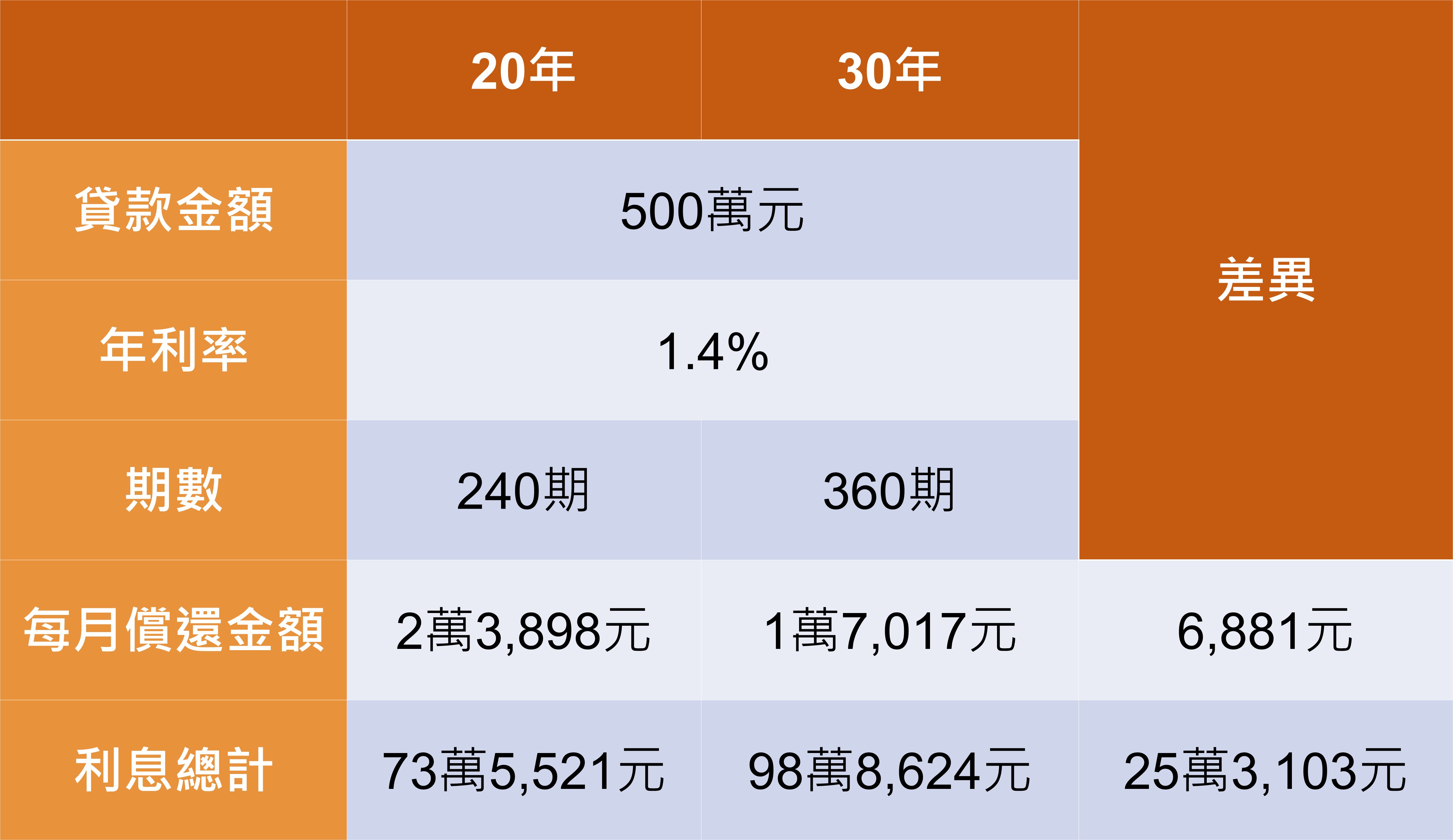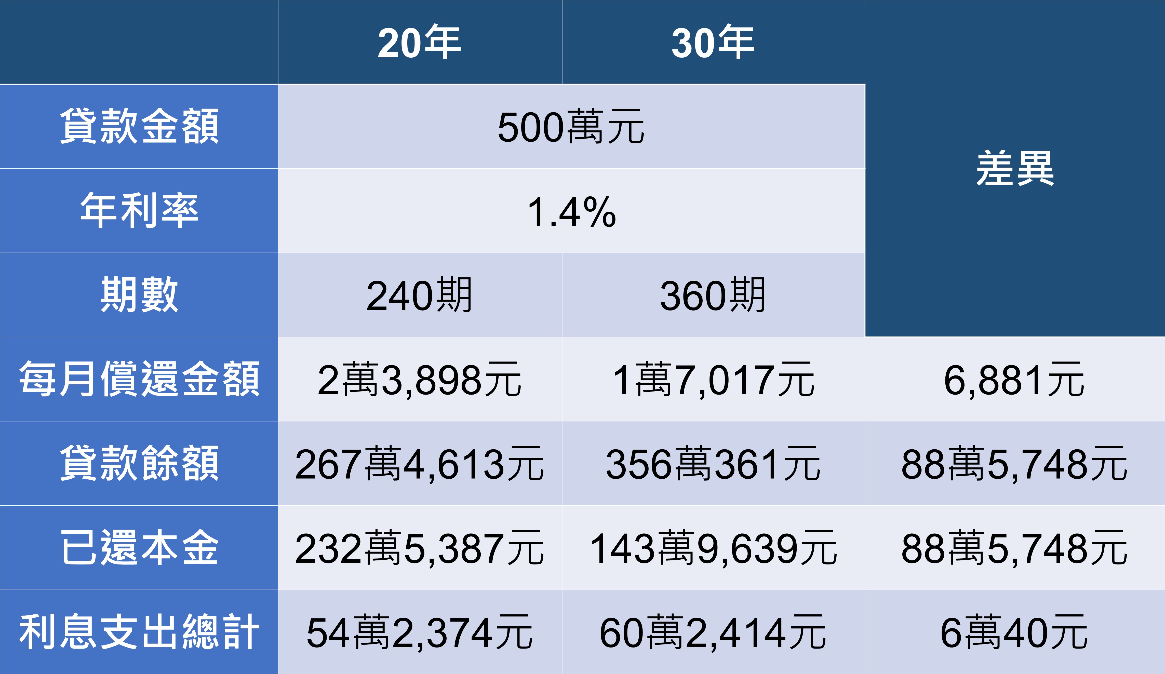 常見貸款年限為20年及30年,假設同樣借款500萬元,在利率1.4%的狀況下,兩者分別要還多少錢呢?
