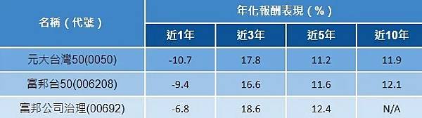 表:台股市值型ETF長期年化報酬率皆雙位數